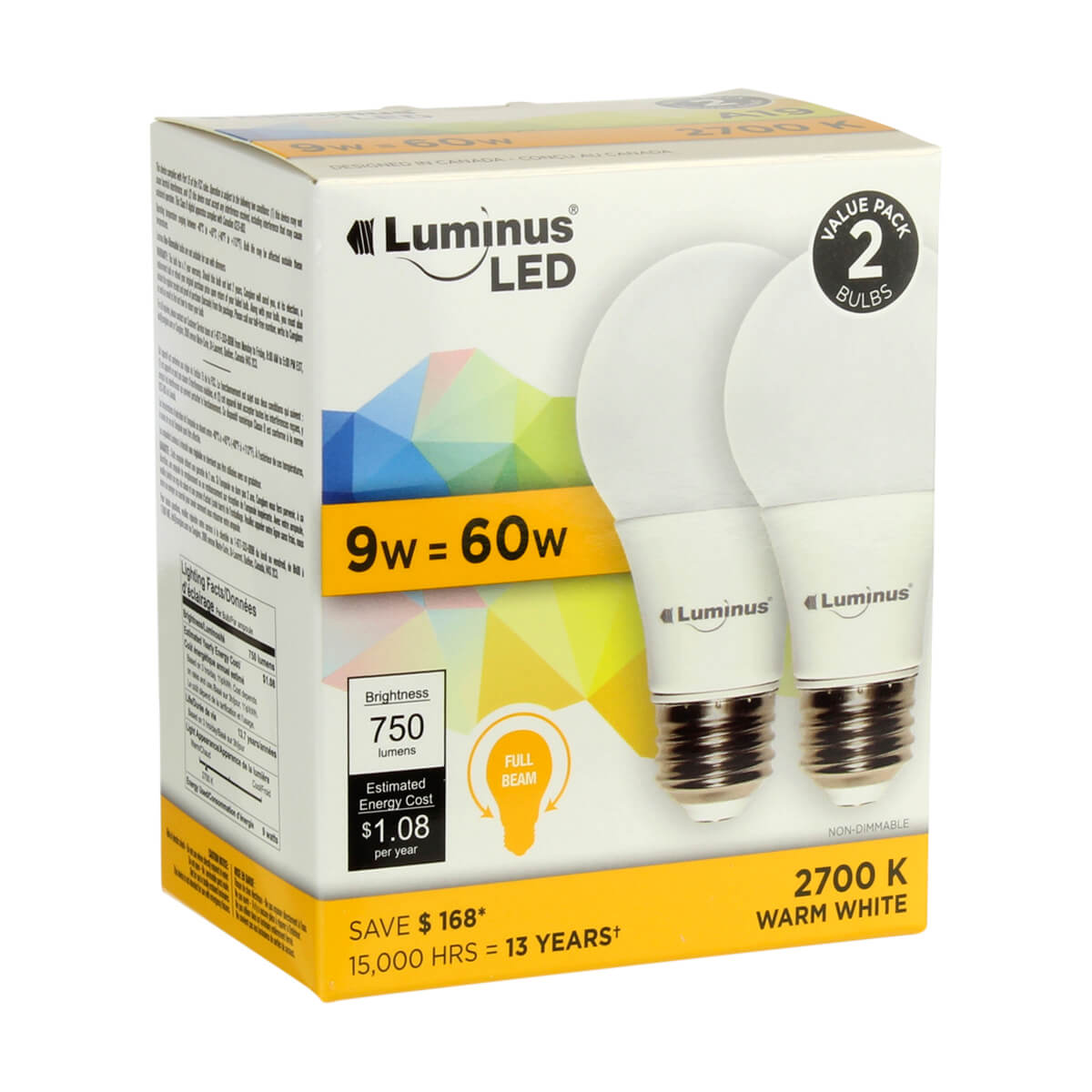 This Luminus set of two 9 Watt LED A19 Light Bulbs is a great lighting solution for your living space. These long-lasting LED bulbs feature a 200° beam, have a lifespan of 15,000 hours and emit a warm white glow (2,700K).